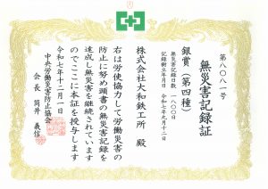 当社はこのたび、中央労働災害防止協会より「中小企業無災害記録銀賞(1800日)」の表彰をいただきました。